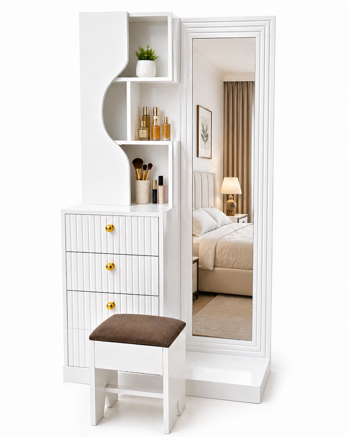 White Dressing Table Kenya is a stylish and practical bedroom furniture piece designed to add beauty, storage, and convenience to your daily routine. With its elegant white finish, full-size mirror, spacious drawers, open shelves, and matching stool, this dressing table creates a perfect grooming and makeup station while enhancing the look of your bedroom.